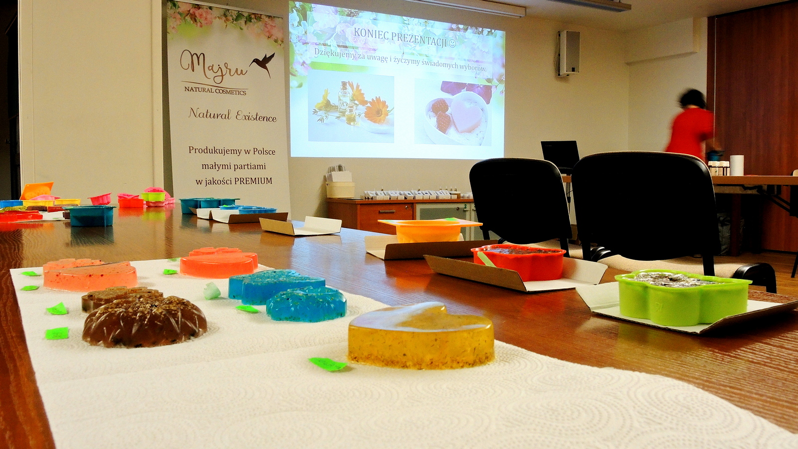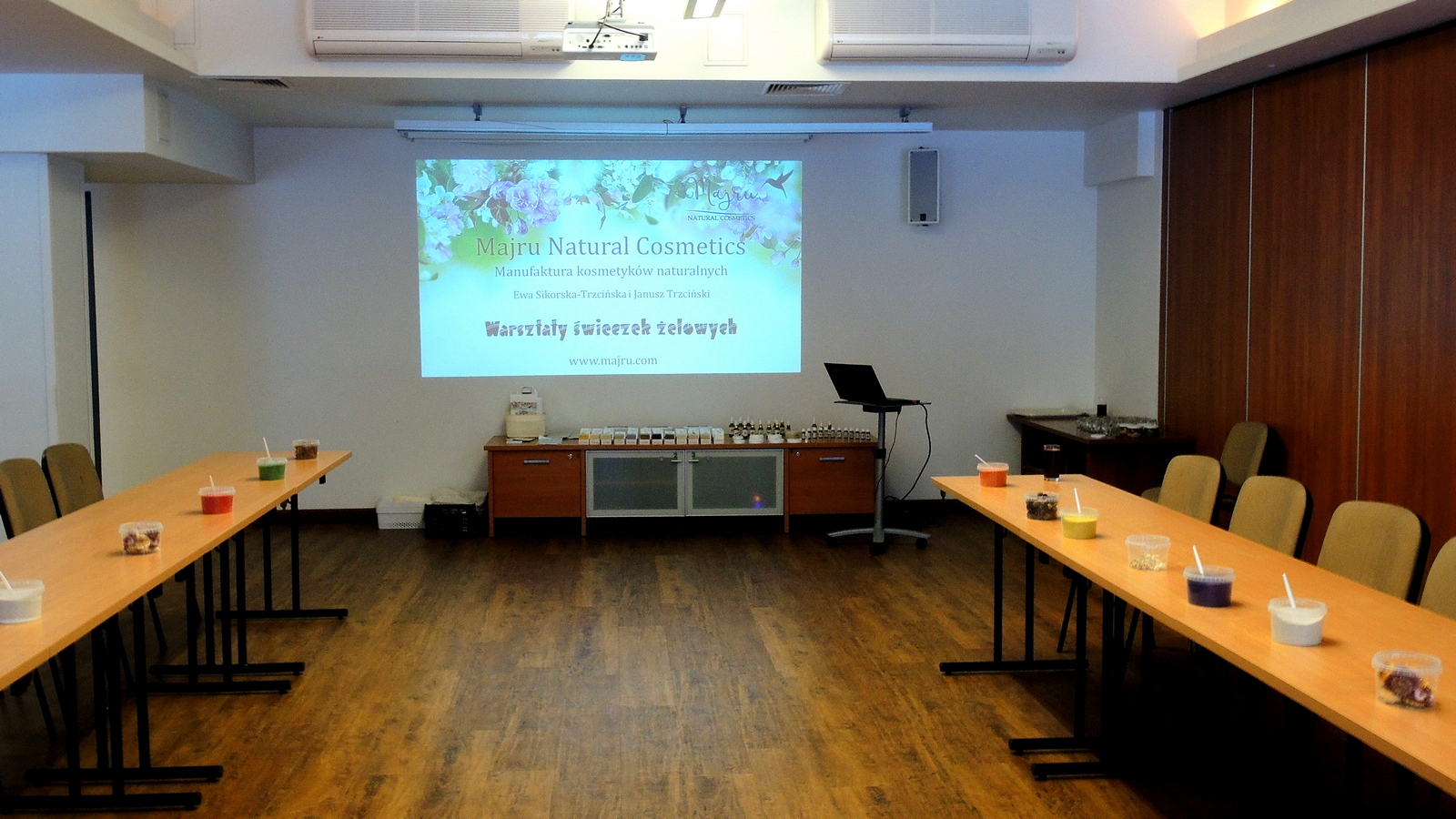 W warsztatach uczestniczyły grupy po około 20 osób w każdej. Podczas zajęć prezentowana była część teoretyczna zawierająca ważne informacje z zakresu korzyści, ale również zagrożeń wynikających ze stosowania produktów kosmetycznych. Duże znaczenie w naszej prezentacji miały aspekty prozdrowotne oraz pielęgnacyjne. Część teoretyczna zawierała również szersze omówienie znaczenia oraz konieczności stosowania aromaterapii z zastosowaniem naturalnych olejków eterycznych. W części praktycznej, pod okiem prowadzących, Uczestnicy samodzielnie wykonywali odpowiednie przedmioty, które potem zabierali ze sobą.